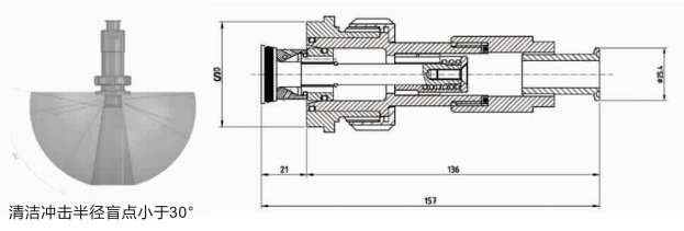 可伸缩清洗喷嘴头在不使用时与被清洗设备(如喷雾干燥机、旋风分离器、流化床、储罐、管道等)内壁齐平。在操作过程中,缩回位置不会干扰工艺,并可消除产品滞留。操作过程中,水在压力下泵送到喷嘴,迫使喷嘴头进入正确位置以清洗设备。一旦供水停止,喷嘴头自动缩回至原始位置。