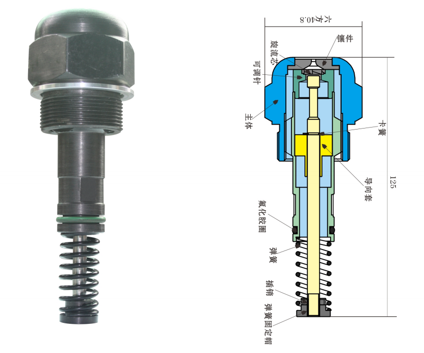 能量喷嘴是一种可以调节喷雾流量和角度的压力雾化喷嘴,能量喷嘴内部有回油通道和顶针,当回油阀打开时,可以通过顶针改变回油通道的面积来控制回油量和角度。