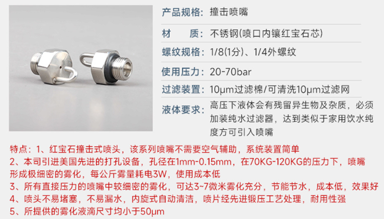 JM红宝石冲击式鱼钩喷嘴不易堵塞、耐磨性好、喷雾均匀,可有效提高产品质量和生产效率;可有效调节加湿量和喷雾效果。该系列喷嘴无需气助,系统安装简单;喷雾雾点细密,雾化充分,节能节水,成本低,效果好;不锈钢喷片采用先进锻造工艺加工而成,耐用性强,是同类喷嘴寿命的2.5倍。