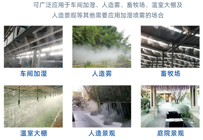 润湿除锈、空气加湿、化学处理、化学喷洒、液体喷洒、烟叶加湿、药片涂装、烟气蒸发降温、部件降温、果蜡喷洒、瓷砖上釉、厂房加湿、盐雾测试、人造雾、其他场所加湿等。