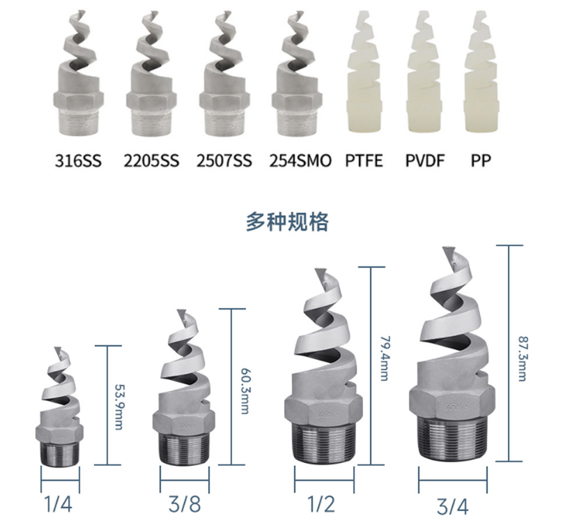 流量和喷射角度范围广泛。对于给定的管道尺寸,空心/实心螺旋喷嘴的喷射角度范围为 50°-170°,液体流量范围为 2.6-6330 升/分钟。
