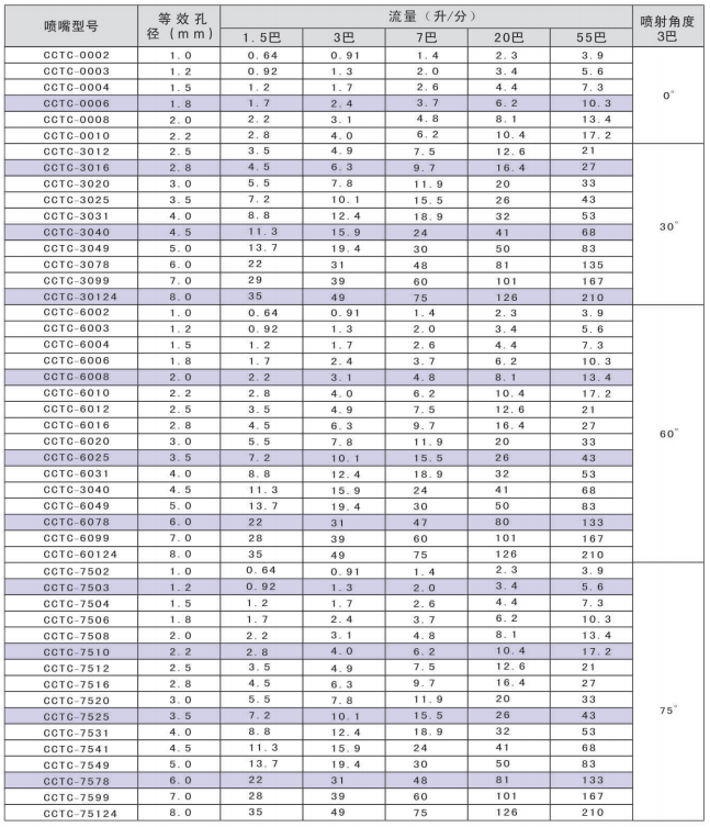 1. CCTC系列喷嘴是专门设计刷式喷杆的低压扇形喷嘴,喷嘴角度有0°、30°、60°、75°,喷嘴安装时需配CY28624-001垫圈。